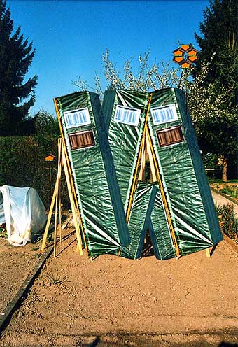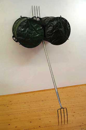 Rainwatcher: The Wasp, 06, mixmed, 148x65x65cm ................Early Bird: Transparenter, 05, mixedmedia, 30x30x120cm ...................................................................................................Schädlingslocker, 03, mixmed, 280x80x40cm