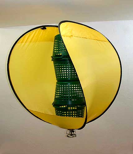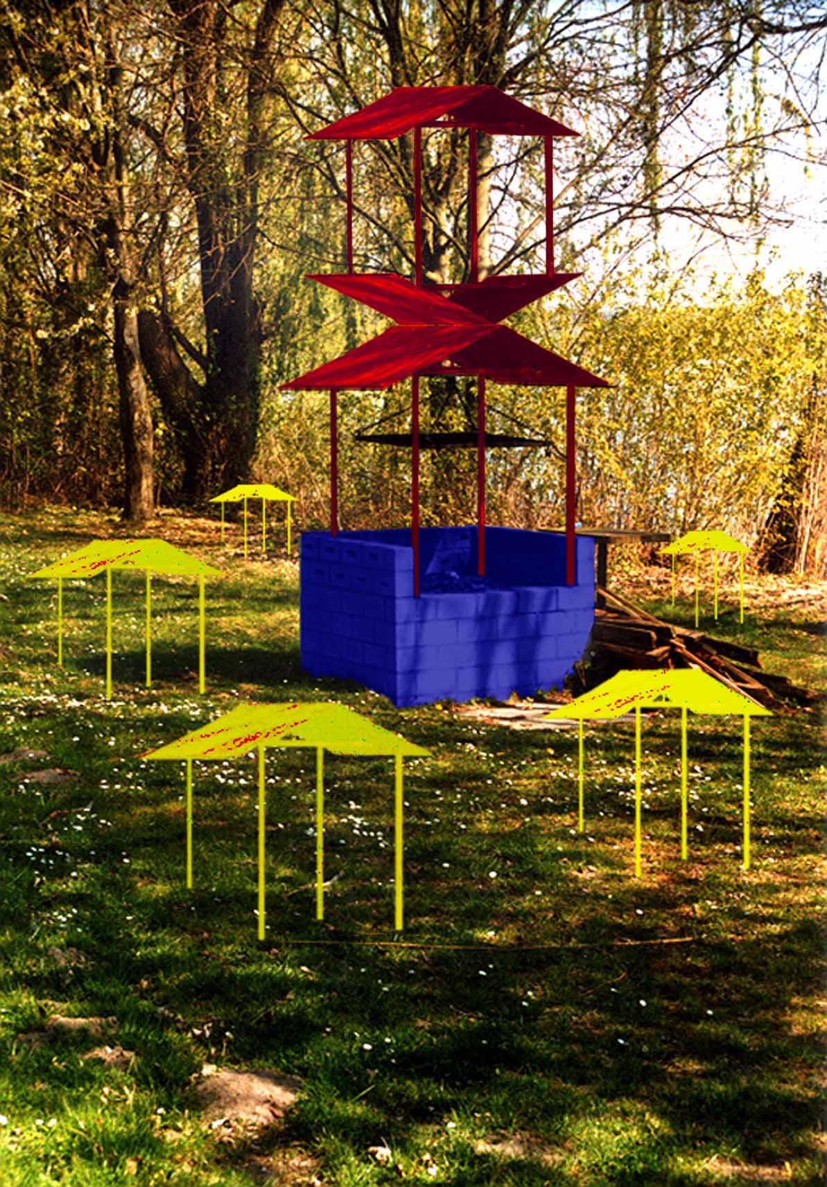 Early Bird: Yellow Echo, 06, mixedmedia, 30x30x90cm .......................................................................................Pavilloppel, 03, digitaler Entwurf. ..................................Sunrise Gelb, 06, Sonnenschirm a. Keilrahmen, 125x125cm